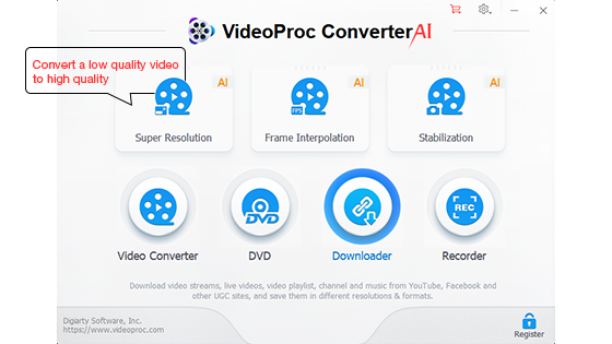 Fueled by new AI models and "Fast Mode", VideoProc can upscale SD videos to 1080p/2K/4K for better clarity and details in more efficient AI processing.