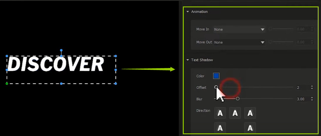 Go to the inspector panel to find settings for changing text content, text color, text space, text border, text shadow, font size, and more.