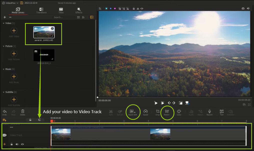 Drag and drop the loved video from your computer into the Media Library. Drag it into the Video Track.