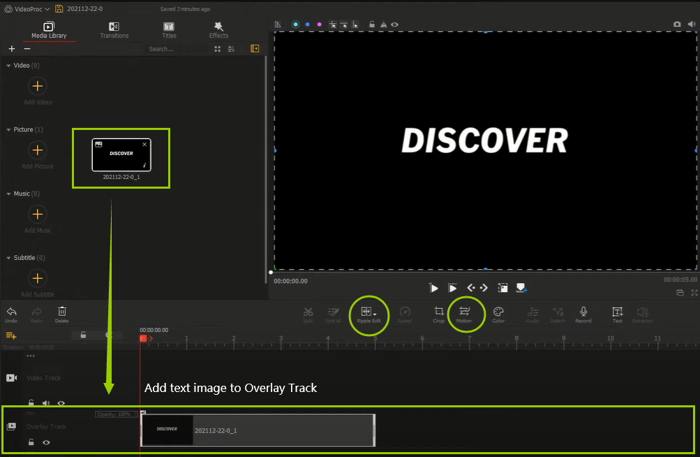 Here, you can choose Ripple Edit and then drag the ends of the text image clip to change its duration. You can also hit the Motion button and then add a motion effect such as zoom in and zoom out for making the text image look more dynamic.