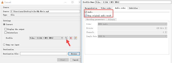 Step 6. Hit the wrench icon and select "Keep original audio track" in "Audio codec". Save the changes.