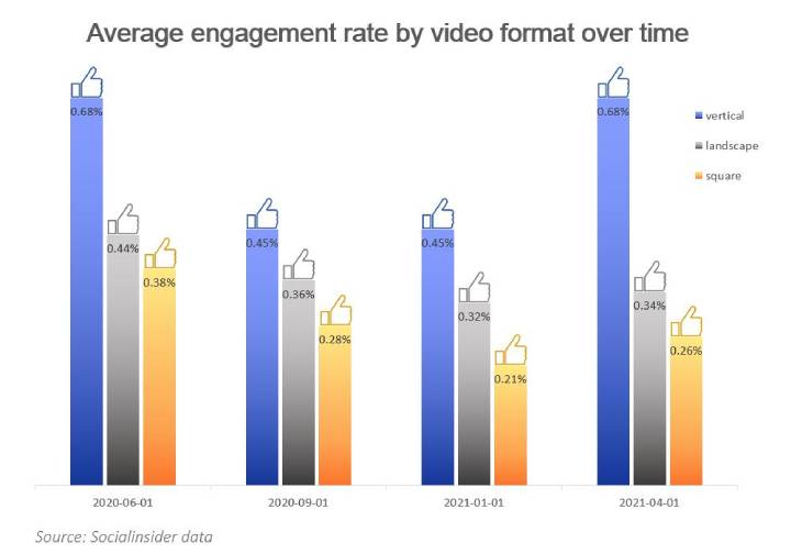 Socialinsider conducted a Facebook video study this year. According to the study, the vertical video is the most used video format and drives the highest level of engagement on Facebook for all profile sizes. That makes sense since most people use smartphones to access Facebook. To explain the result more intuitively, we turn to data and remake a bar graph on the average engagement rate by video format over time.