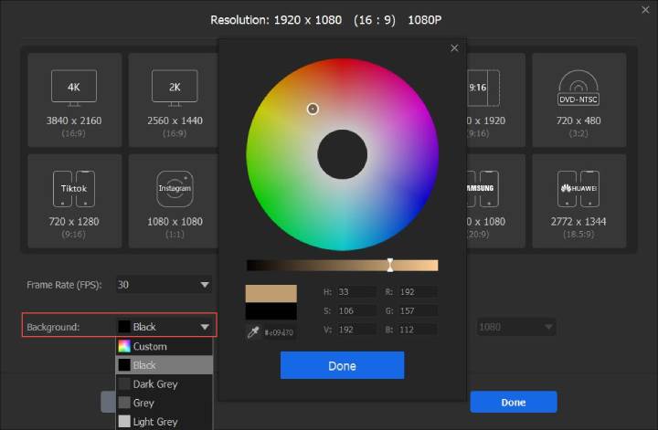 Click and expand the Background tab in the pop-up window. You can select a color from Black to White, or choose Custom. VideoProc Vlogger allows you to change the color of the cinematic bars if you'd love to. In this case, we'll select Black.