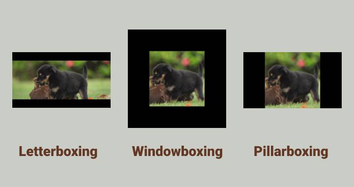 Letterboxing refers to the black bars appearing on the top and bottom of the content. Pillarboxing is the black bars going on the left and right-hand sides of the content. While window boxing is when the content is framed by margins around the content.