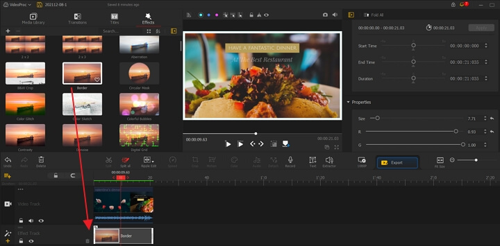 Step 3. Click Effects and choose the Border filter. Drag the Border filter to the Effects Track. Click this filter on the timeline and you'll see detailed settings on the right panel. Grab the Size slider to adjust the size of the border. You can also change its color and alpha.