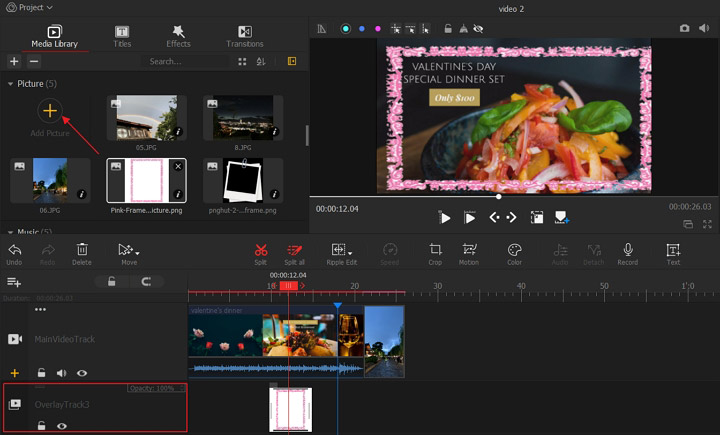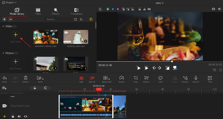 Step 2. Click Add Video icon to upload your videos to media library. Drag it to the Video Track to preview it.
