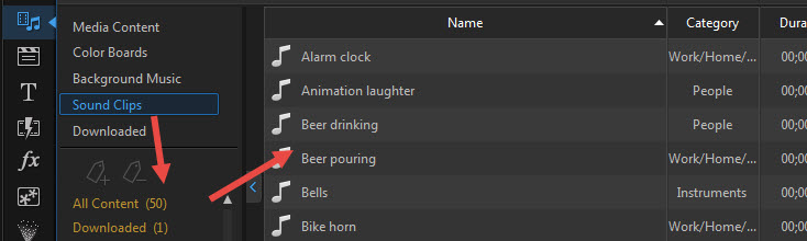 Using Pinnacle Studio to add sound effects is easy since there is a bunch of stock audio clips. From the left side content bar, you can click on the musical note icon, and find all kinds of sounds grouped for different scenarios. Bells, gunshots, squeaks, vehicles, electronics, and everything you can imagine.