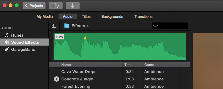 iMovie is the default video editor for Mac, and it also has an iOS version. You can add your own sound effects, or using the stock sound effects library. iMovie group the stock audio tracks by themes such as ambiance, animals, booms, foley, jingles, machines, Sci-Fi, sports, etc. As for more customizable options, you can download free sound effects online, and drag them into iMovie's media bin.