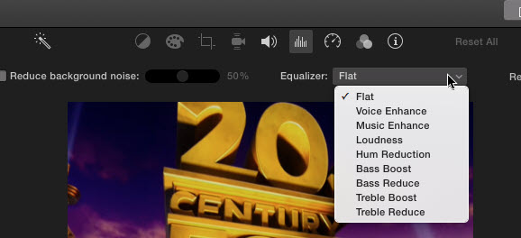 Step 6. Click on an audio clip, and hit the wave-shaped icon above the monitor window. Select a sound effect (sound FX) from the drop-down menu of the equalizer.