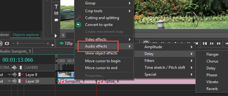 - To add effects to an audio file, click on the audio clip, and go to Audio Editor > Effects. You can add audio panning, echo, equalizer, reverb, etc.