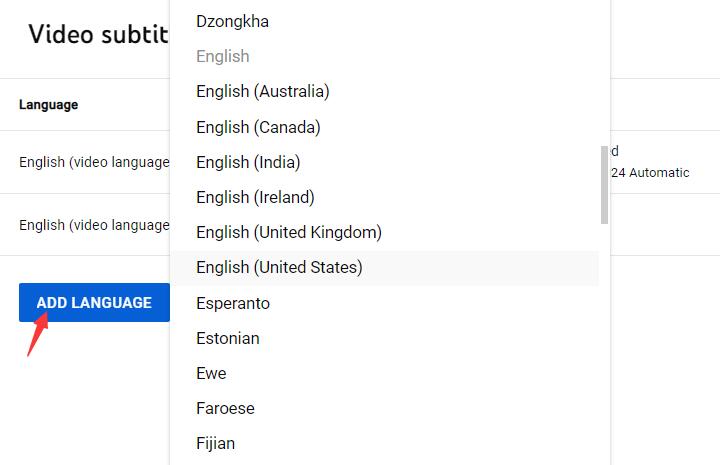 Step 3. Now in the Video subtitles window, click on Add Language and choose the appropriate language for the text you wish to incorporate. Click the Add button.