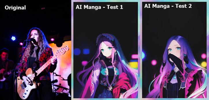 We used the Different Dimension Me AI generator twice for this picture. It turned out that each time it will create different manga. The second test has a hilarious error, where the AI wrongly treated the shadow dropped from the microphone as some kind of mask around the singer. Most importantly, both tests fail to generate the guitar for the artist.