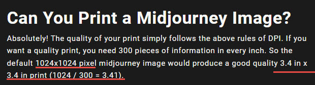 The official image size document from Midjourney also noted that, since the default resolution is 1024x1024 pixels, and a quality print requires 300DPI, thus the recommended print size for a 1024x1024 image would be 3.4x3.4 inches.