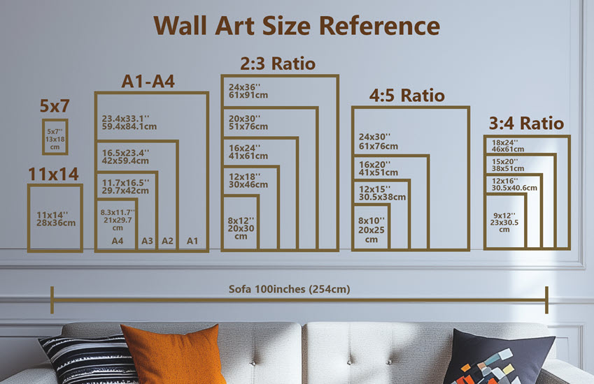 Here is a handy Wall Art Size guide, showcasing commonly used wall deco frame sizes and aspect ratio. You can use that on-set sofa as a visual reference to see how large the frames are in reality. To get the best quality print, don't forget to use VideoProc Converter AI to upscale images to higher resolutions.