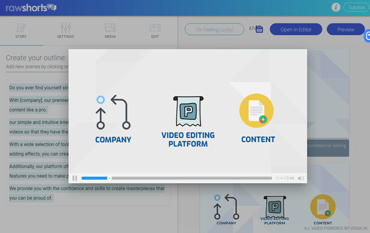 As a popular online video maker now powered by AI, Raw Shorts includes an AI video script generator, AI video maker, and online video editor in one stop. You can paste your own posts or ask it to generate a script for you in terms of a specific topic and style. Then it will guide you to choose a template, edit graphics, and texts, and preview the final video online. You can also find some realistic videos in Raw Short, but they are not AI-generated. Raw Shorts accesses 1+ million commercially licensed videos and animations to match the words you type in.