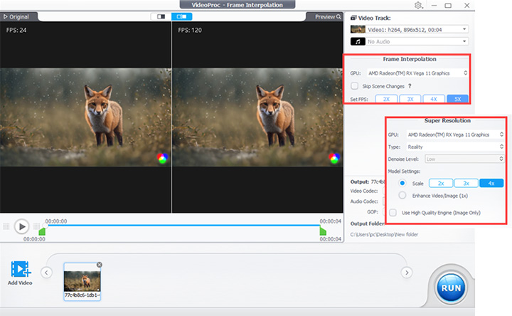 VideoProc Converter AI features AI Super Resolution to enlarge SD videos and images to up to 4K and AI Frame Interpolation to boost FPS to 60fps/100fps/120fps and more.