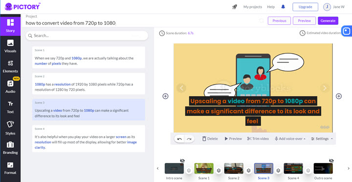 Pictory is a cloud-based AI video maker. In essence, it combines reverent stock footage into an entire video. After summarizing the texts you input, it searches for the best footage to match your words among over 3 million high-quality royalty-free video clips, images, and music. Meanwhile, it converts texts to speeches in various languages and accents.