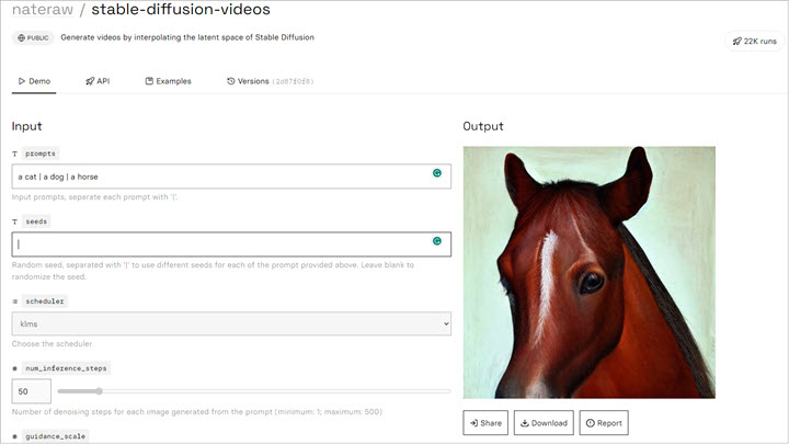 Stable-diffusion-videos is an online tool built on the Stable Diffusion model. From its demos, you can see that Stable-diffusion-video can synthesize videos about animations and food with zero shots. But note that, it only shows still footage and cannot convert texts to frames in motion. So far, it's not a good assistant to generate videos for your video creations, but a good place to test and make AI videos for fun.