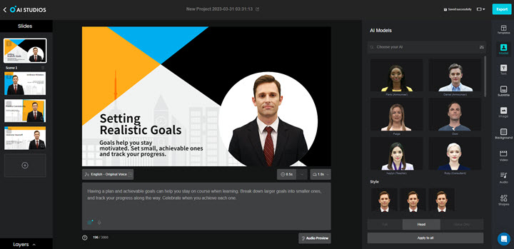 DeepBrain is a tech company devoted to providing practical AI human solutions and has gained CES Innovation Awards Winner in 2022. In the sphere of AI video production, it launches text-to-speech and text-to-video features with realistic AI persons from various nationalities. By simply inputting texts or asking it to create a video script, you can get a well-organized presentation video, which is applicable to social media posts, e-learning, and video marketing.