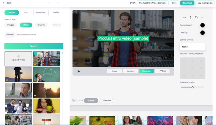 Designs.ai is an online design platform capable of making posts, logos, graphics, and videos. Driven by the latest AI tech, Designs now can create videos from scripts with natural voiceover. And compared with other text-to-video tools, Designs offers you more aesthetic stock videos, images, and background music. Videos from Designs look like they were made by professional editors but were actually made with a few clicks.