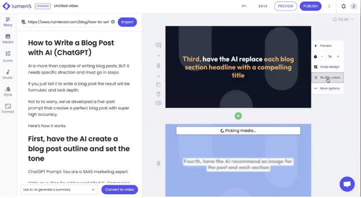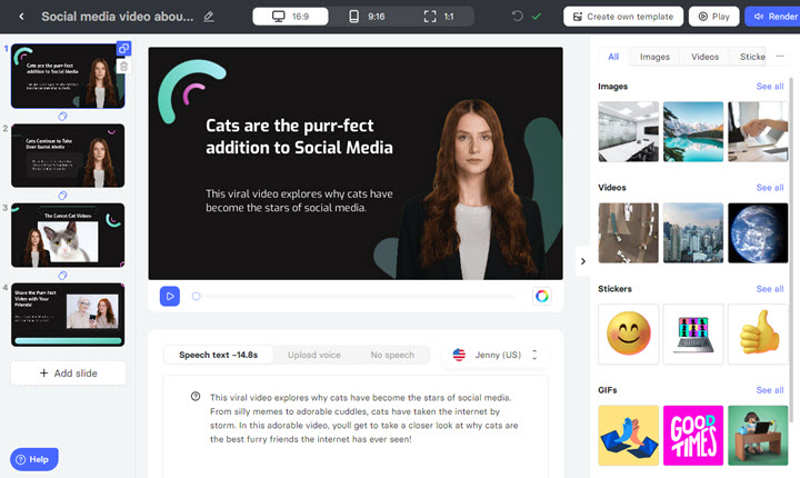 Powered by AI and machine learning, Lumen5 can summarize the content and match each scene with relevant stock videos. Besides, it calculates and delivers the best visual output of text positioning and scene compositions. To make the presentation video more engaging, Lumen5 also adds transitions, motion graphics, and sound effects to the video. Even though it cannot generate AI avatars, it helps spice up your talking head video with callouts, cutaways, and auto captions.