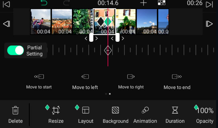 You can adjust duration of picture, speed up video clips up to 4x or slows them down to 0.2x. For color adjustment, you can use filters or manually adjust contrast, hue, exposure and other related parameters. The texts are customizable, and you can also add your own stocks or add animations to the text.