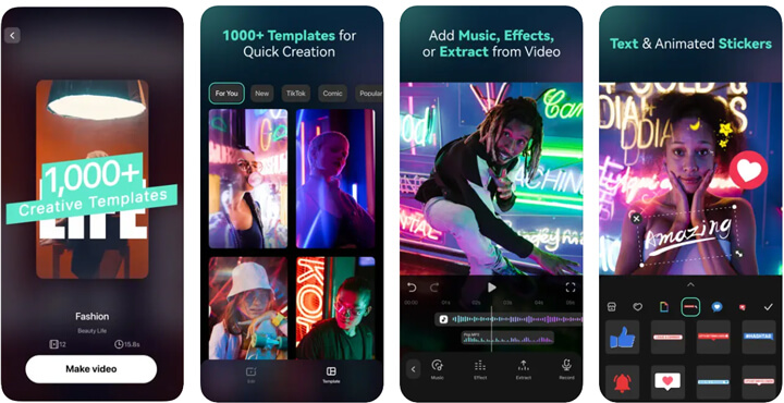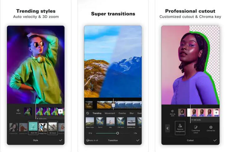- Key features: feature-rich video editing app for short videos, direct upload to TikTok, green screen, background removal, and color correction.