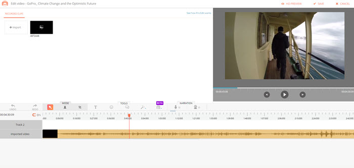 You can load videos from your Google Drive account, or just paste a link of a video online. Then go to the easy cut and trim part. It is not versatile as other editors, but more like a joiner that merges video clips, audios and images together.