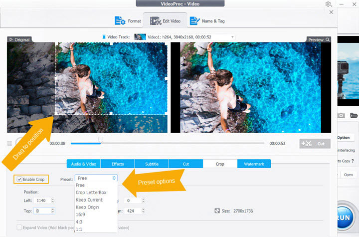 You can easily change the video aspect ratio online by entering the pixel value in the left, right, top, and bottom dialogue box. VideoProc Converter AI also presents its users with the option of getting their desired video size by setting a specific position.