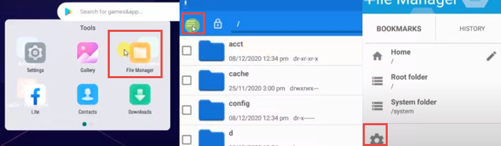 Go to Tools > File Manager > Menu (Three lines icon) > Settings (Gear icon).