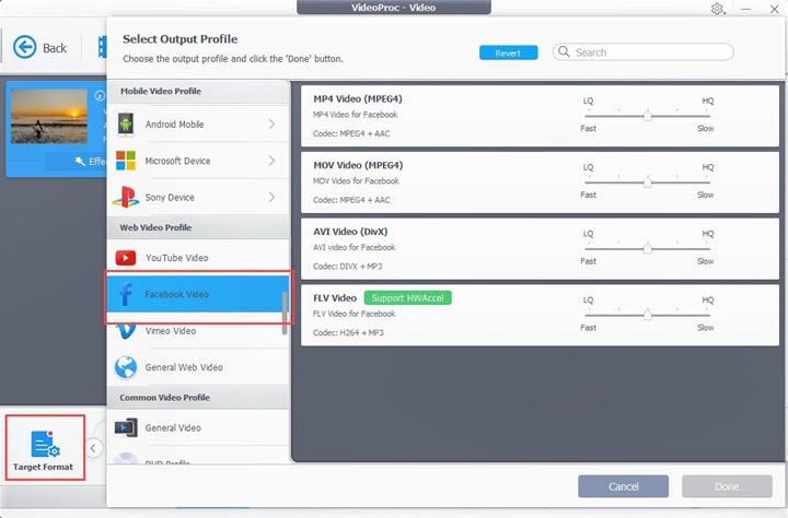 - VideoProc Converter AI also provides 7 different methods to compress your video for Facebook.