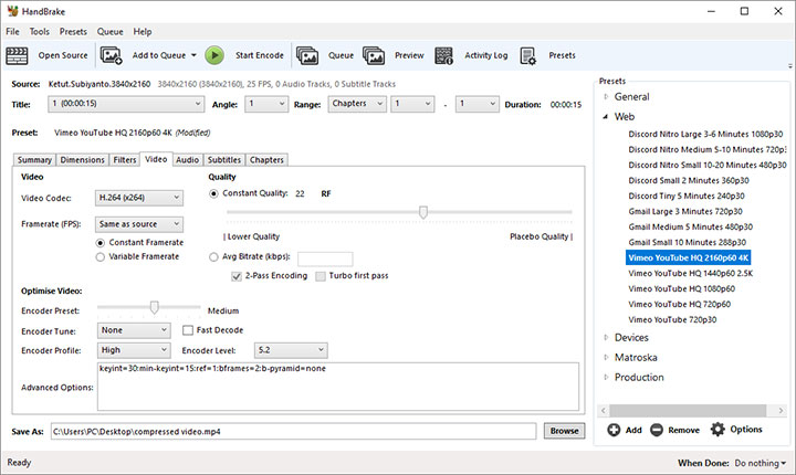 HandBrake is one of the best programs for video compression on the market. It's free and open source. It integrates many audio and video libraries to process the most common multimedia files. Users can get quick results with various profiles optimized for different devices and platforms, including YouTube. It also offers many basic and advanced options for customizing precise encoding settings.