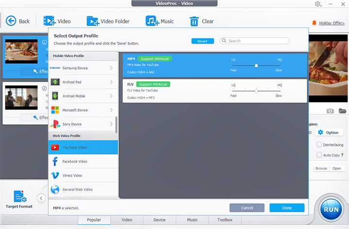 Select the preset YouTube format by clicking Target Format > YouTube Video > MP4. Then click Done. You can also set format properties to get the desired output video. VideoProc Converter AI allows you to manually adjust bitrate, CRF value, frame rate, aspect ratio, video resolution, etc.