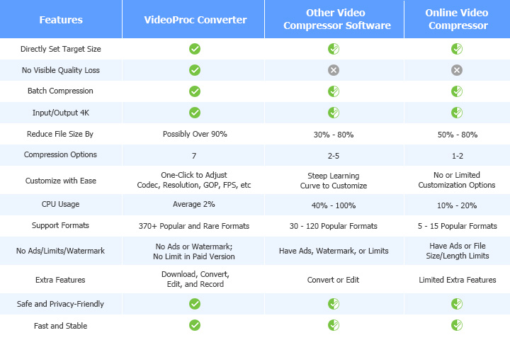 Apart from the video file per se and hardware configuration, the compression ratio and the video quality also depend on the video compessor software you are using. VideoProc Converter AI excels most peers in both fileds with its timely support for the latest HEVC codec and advanced GPU acceleration tech. Now download and keep VideoProc Converter AI at hand to compress long videos or large 8K/4K/1080P videos without quality loss in a few clicks.