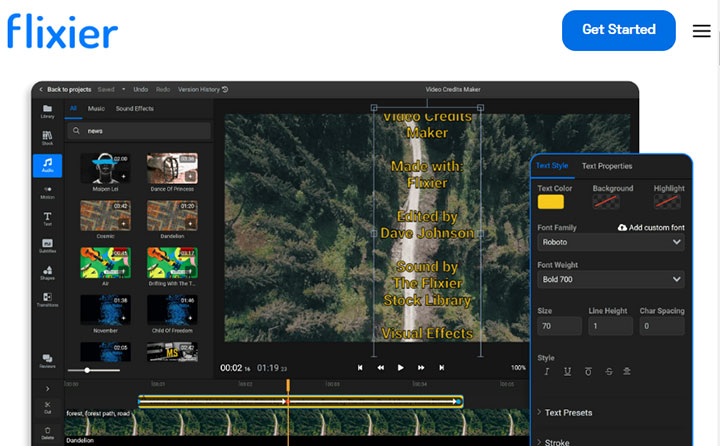 Flixier is a cloud-based video editor that runs directly in your browser. This handy non-linear video editor is an ideal choice for novice users looking to make simple opening and ending credit sequences for short videos. Once you've added the credits text to your video, you can personalize the fonts and fine-tune every aspect – from font size to color, shadow, and stroke – using the object inspector menu located on the right-hand side of the interface. With the preset animation options and the Keyframe feature, you can easily control how the credits scroll across the screen.