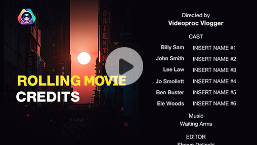 Whether you prefer classic black-and-white scrolling movie credits or want to add a stylish touch with animated text, video clips, cinematic transitions, music, and more, VideoProc Vlogger has got you covered with just a few clicks. You can personalize every aspect of your credits, including text alignment, background color, duration, fonts, colors, and animations, to match your unique style. It also boasts a plethora of pre-designed credit title presets, allowing you to create stunning and attention-grabbing credits for your vlog, ad promos, movies, TV shows, documentaries, or any other video projects in a matter of moments.