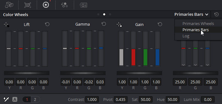 I will do some basic balances in this new node by going to Color Wheels > Primaries Bar on the right. First I will turn off the Lum Mix that I can individually work with channels. In the following, I'm going to take away the excessive colors and introduce a little to the less.