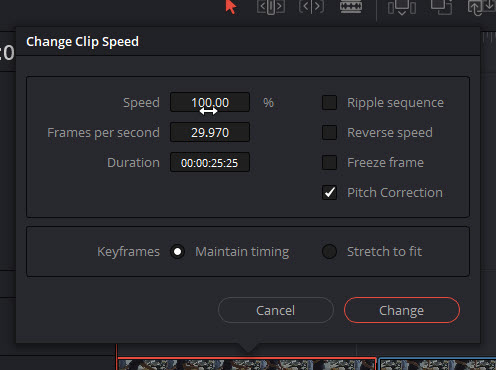 To modify the speed for a clip in Resolve, load the clip on the timeline, right-click the part that your will retime, select Change Clip Speed and a dialogue window pops up. You can modify the Speed by dragging the mouse left to right, or choosing the frame rate per second for the clip.