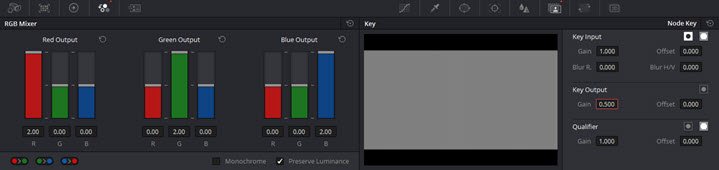 In the first node, I will introduce a little of color by going to RGB mixer and push them to the limit in every color output. Then I will move to Node key and reduce the Gain in the Key Output tab by half. In this way, you can get a neat video by increasing saturation.