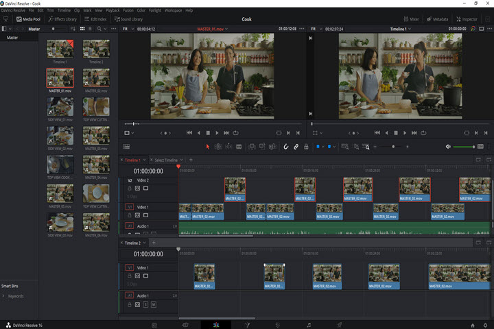 This saves a lot of space to the timelines. The upper timeline shows the entire time of your edits. And the lower timeline shows the detail view of your edits. Furthermore, the way to edit in the Cut page is innovative. The unique option of Source Tape at the Cut page combines all the materials from the media pool into the viewer, which saves a lot of time when selecting materials. It is more suitable for creating rough cuts.
