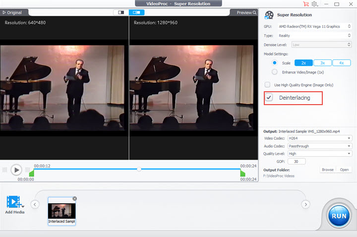 Step 3. Tick the box before Deinterlacing on the right side. Then click RUN and VideoProc Converter AI will start to remove interlaced lines in your video and export the final video on your computer.