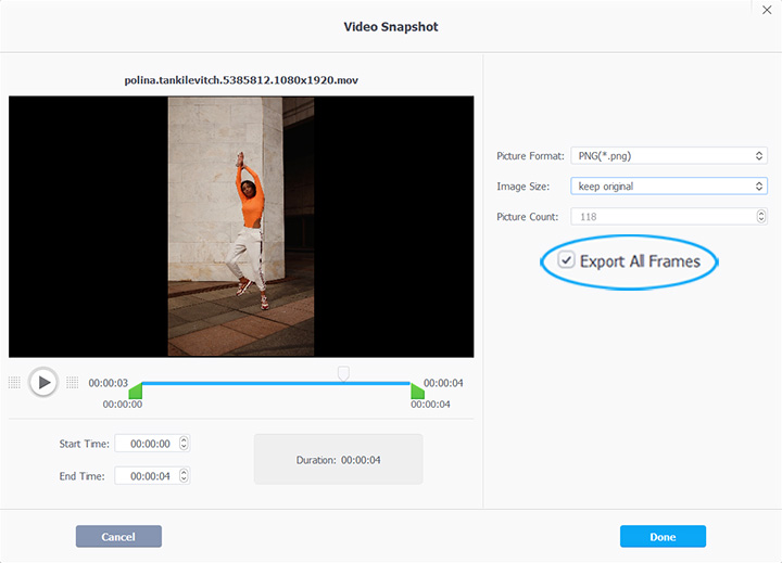 - Set the parameters in the pop-up Video Snapshot window, and click Done when you finish. Choose a picture format, specify the image size and picture count, set the start time, end time, or duration of the video that you want to extract frames from.