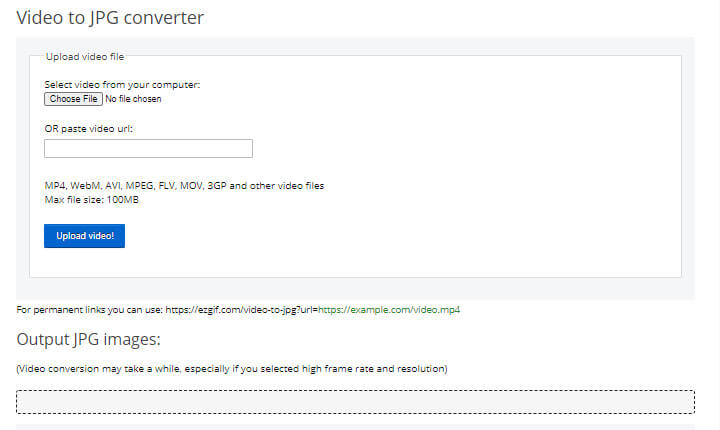 - Upload your video file, or paste the video URL after heading to https://ezgif.com/video-to-jpg.