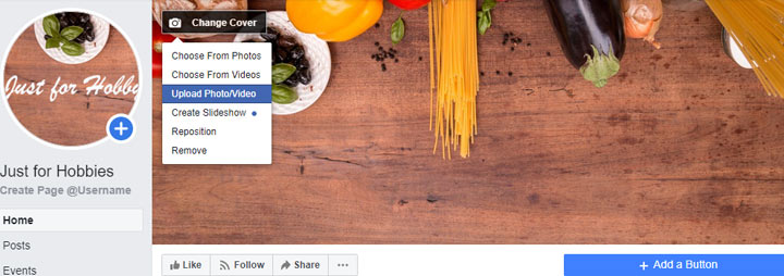 - 1. Navigate to the Facebook cover. Click on the camera button, and click it. Select Upload Photo/Video.
