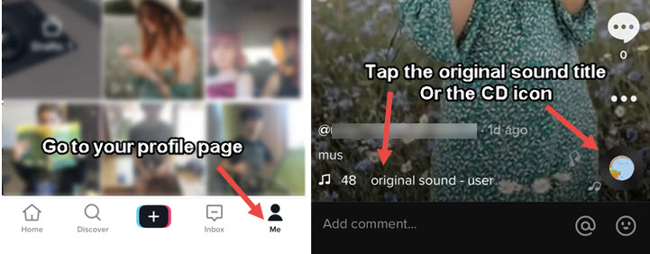 3. Play the video, and you shall see at the bottom a music note icon, and the title says original sound . Tap on it. You can also hit the CD icon (featuring your profile photo) at bottom right corner.
