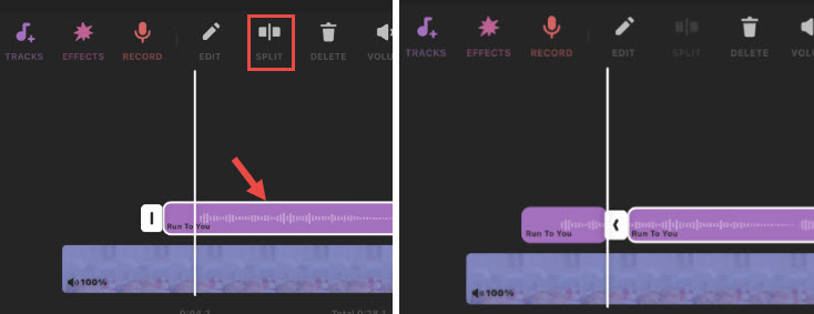 Step 7. Tap on the audio clip, and use the split icon from the tools bar to cut and trim the audio.
