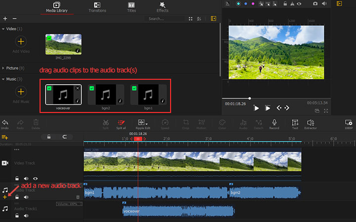 Drag the desired video clip from the Media Library and place it onto the Video Track. Similarly, drag the music clips into the audio track. By default, the music clips will be arranged on the timeline in their original order, playing one song after another.