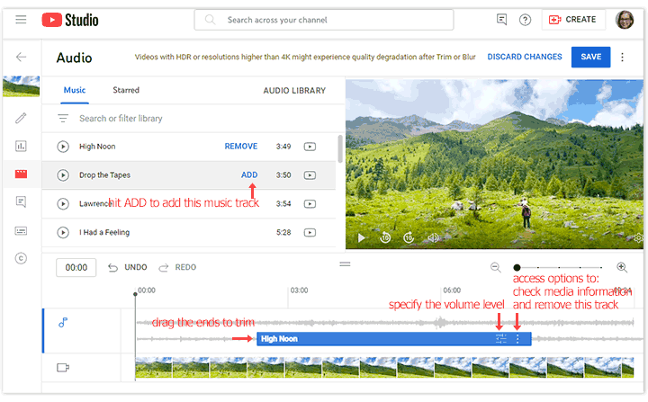 Just because it's easy to add music to a YouTube video using YouTube Studio video editor doesn't mean it's a good solution adding music to a YouTube. Many music and sound effects tracks sound similar, which means that the specific music you need may not be available. Additionally, you are not allowed to upload your music to add to your YouTube video. This limitation, along with the lack of advanced audio editing features, makes it difficult to create videos that are driven by music, such as sync-to-beat music videos. In short, this method restricts the creative possibilities of adding music to your YouTube video.