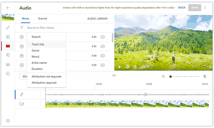 You're allowed to search or filter the music track that works best for your YouTube video by: