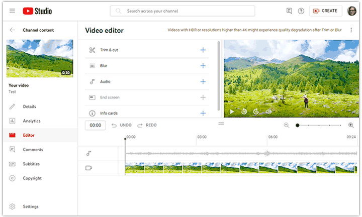 Click the name of the target YouTube video. Click Editor located on the left side of the pop-up new page to fire up the YouTube Studio video editor. Now we have 3 quick editing tools: trim & cut, blur, and audio. Since our target is adding music to a YouTube video, we should click on Audio.